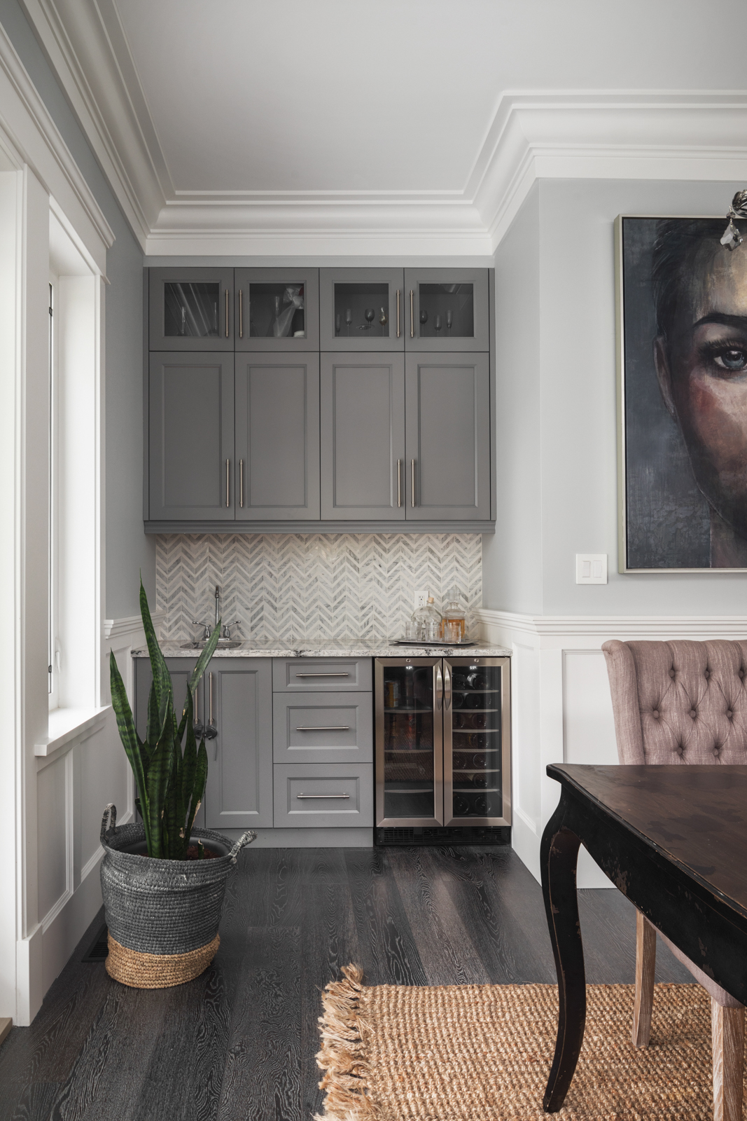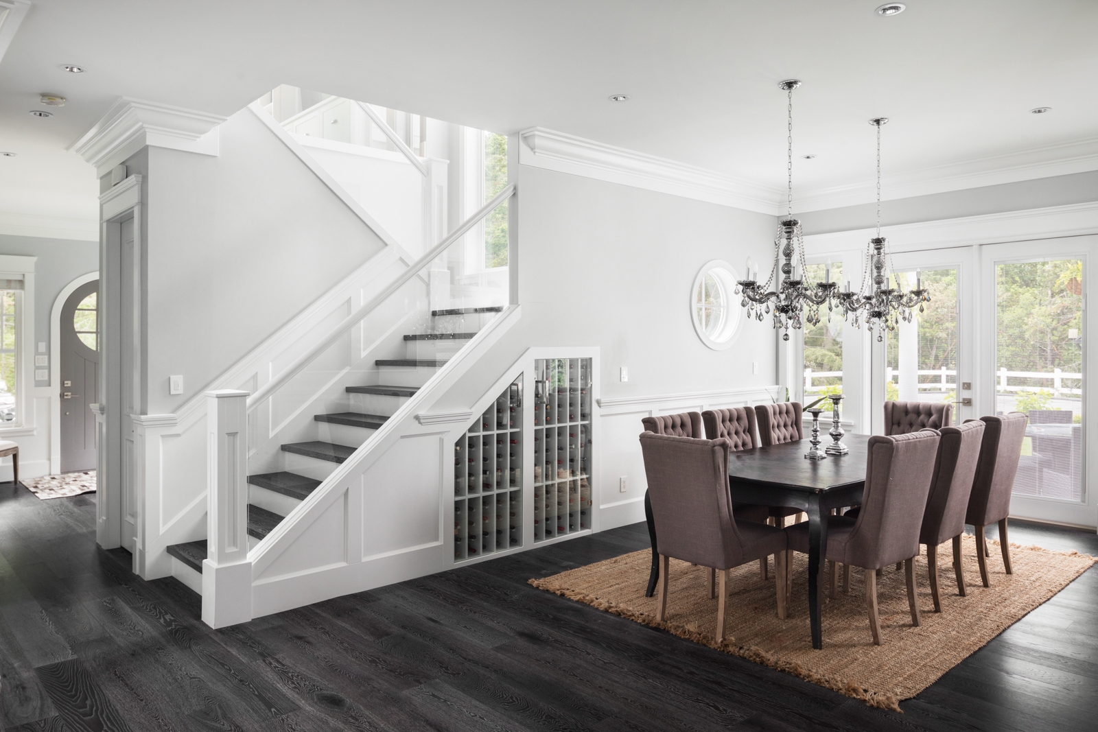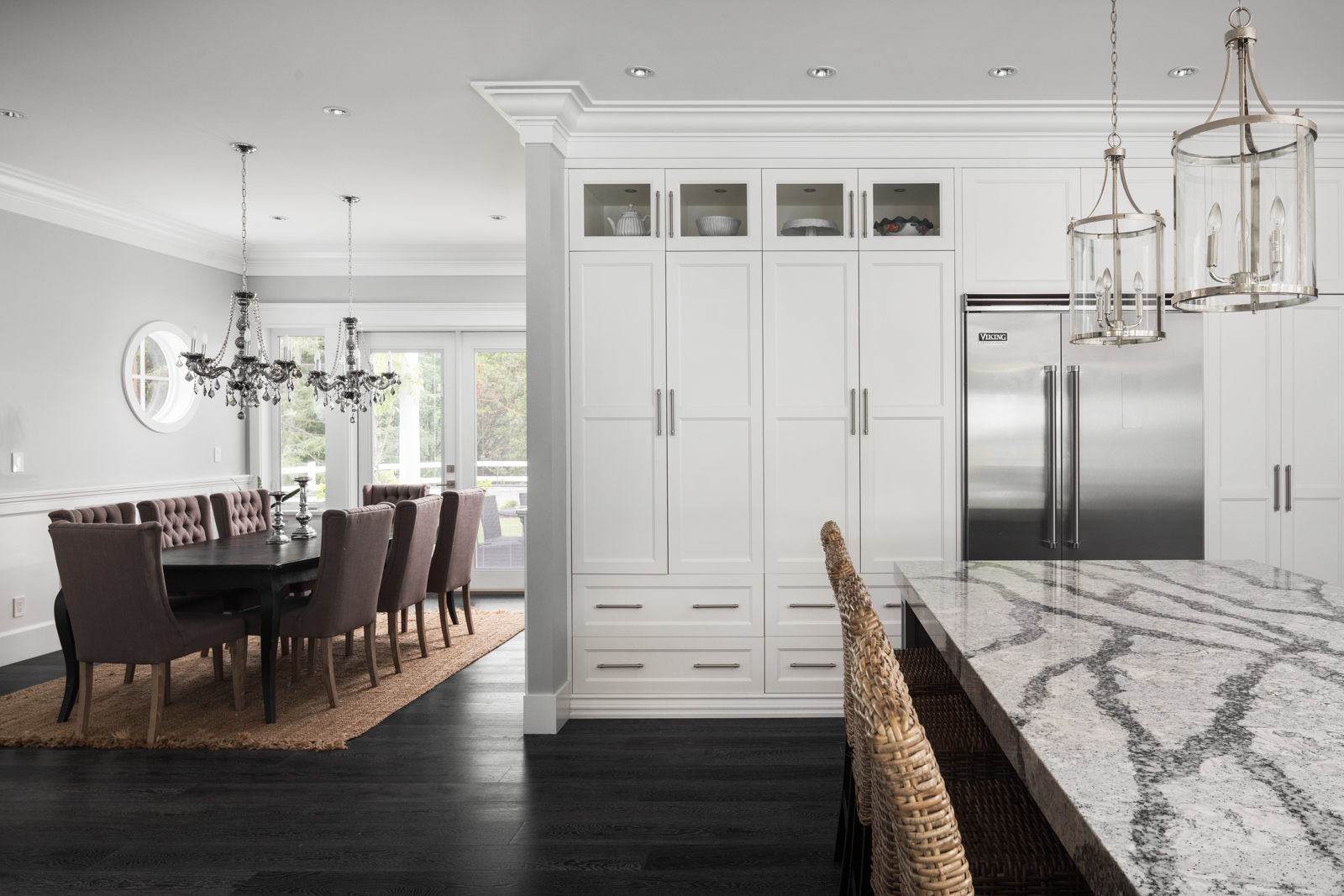 - Entertainer’s kitchen boasts ample natural light and garden views; full-height, wood cabinetry with illuminated uppers boasts dove-tail construction, marble-look quartz, Chevron-patterned backsplash, crown moulding, stainless steel appliances; adjacent dining room boasts built-in wine storage, elegant chandeliers, wainscoting, porthole window and French doors.