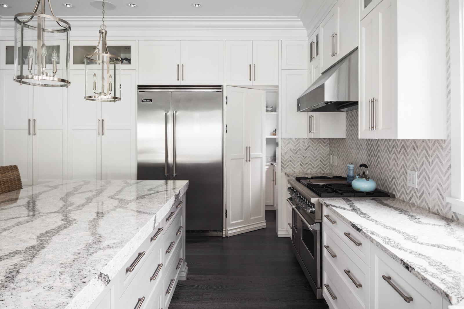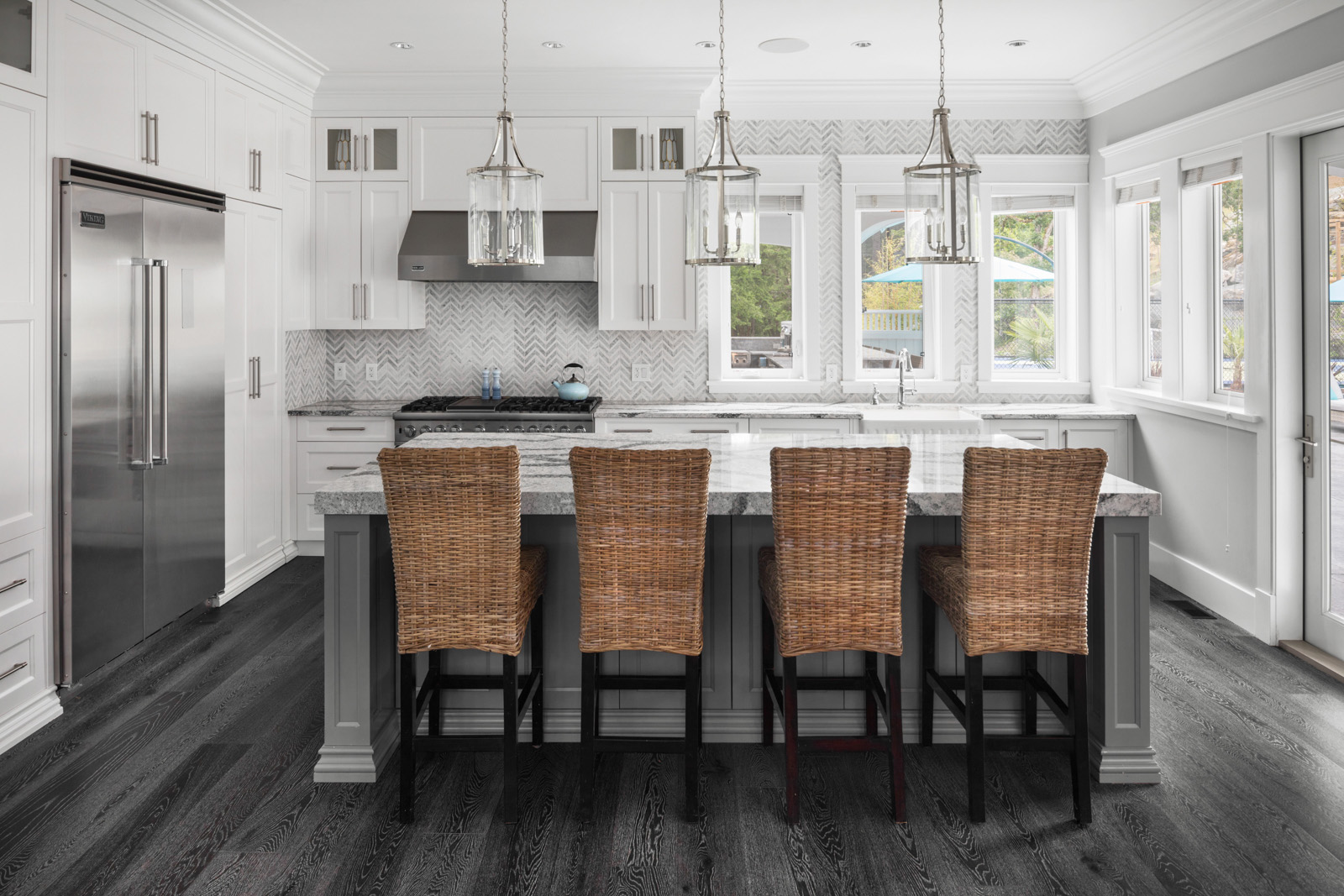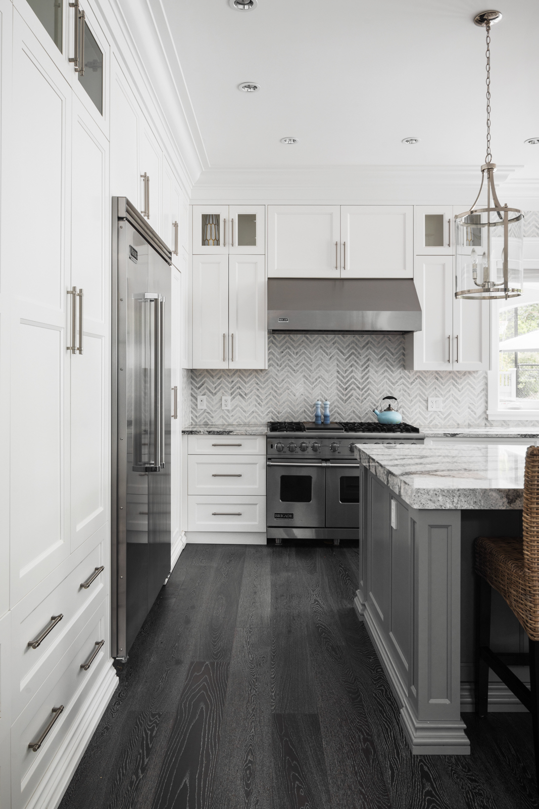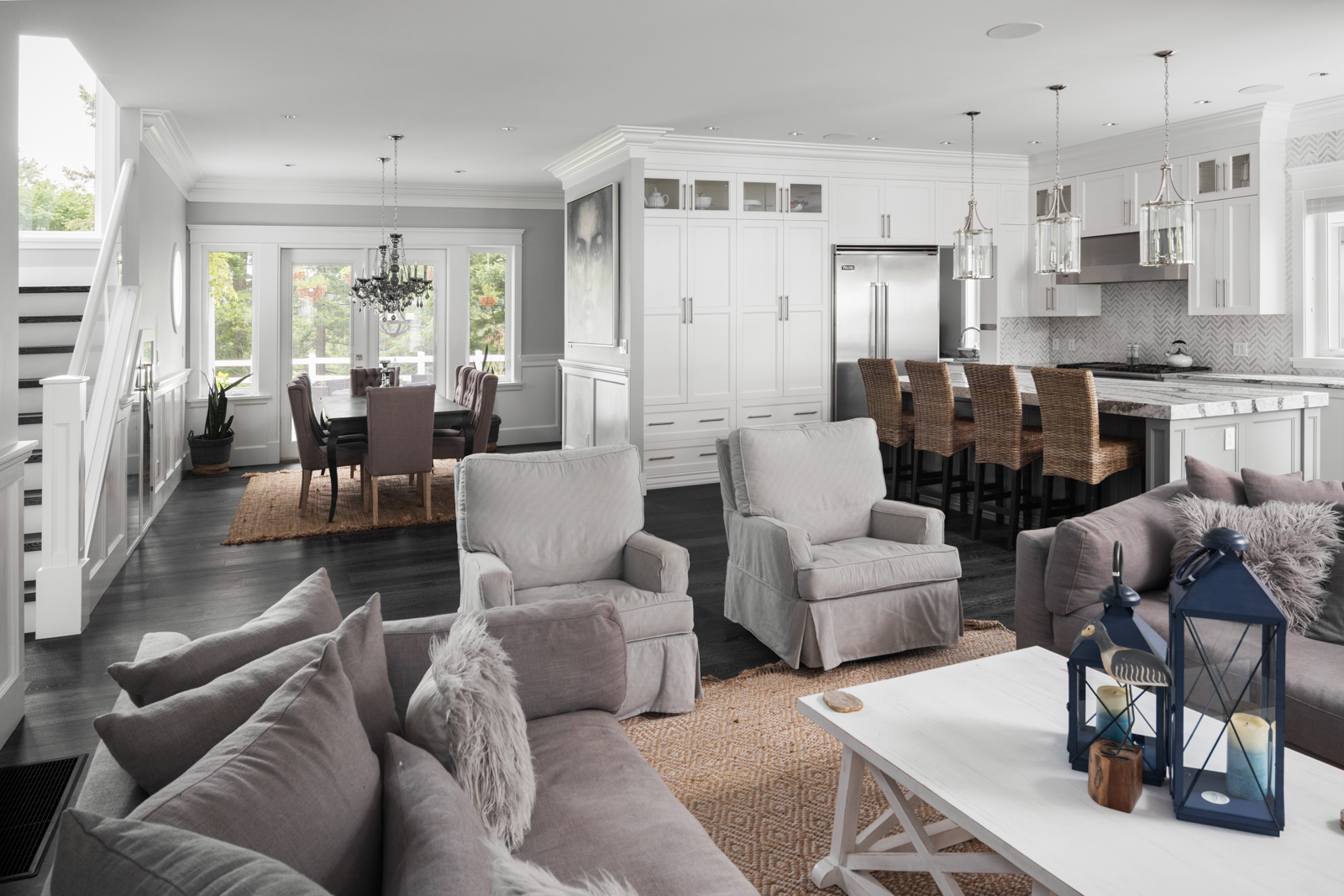 - Entertainer’s kitchen boasts ample natural light and garden views; full-height, wood cabinetry with illuminated uppers boasts dove-tail construction, marble-look quartz, Chevron-patterned backsplash, crown moulding, stainless steel appliances; adjacent dining room boasts built-in wine storage, elegant chandeliers, wainscoting, porthole window and French doors.