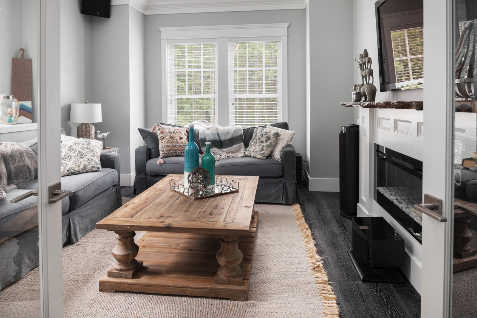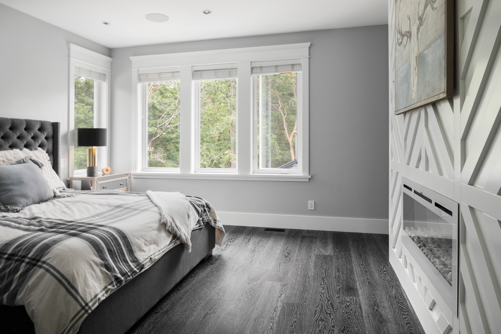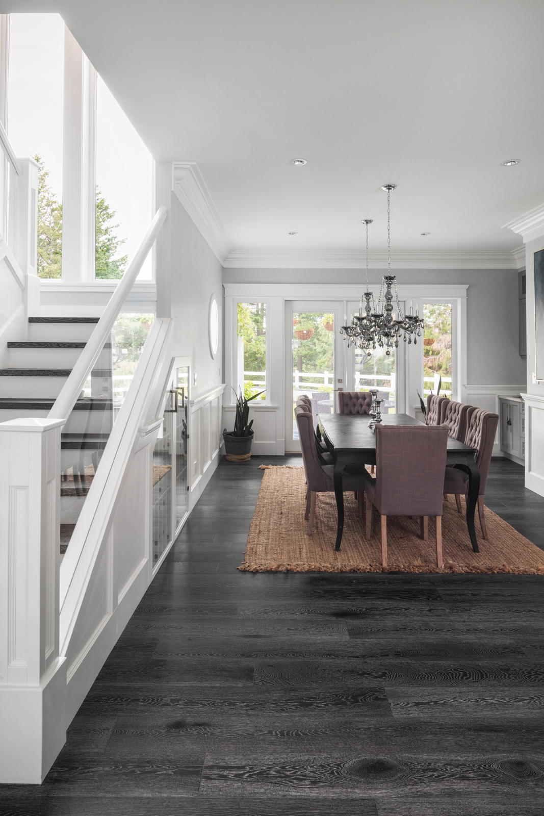 - Charcoal colored, wide-plank oak flooring extends throughout open-plan main living area with bedrooms up; warm, West Coast tones provide a natural transition to the landscape outside the numerous windows. Timeless details include built-ins throughout for ample storage, and French doors extending the living space outdoors.