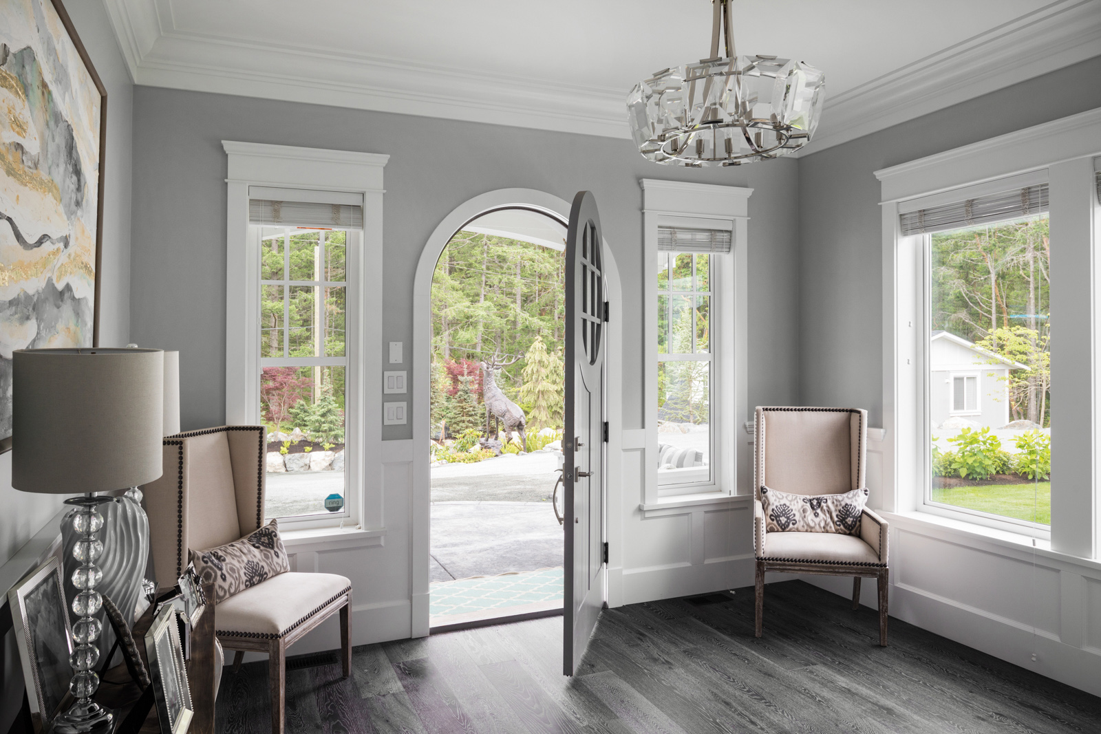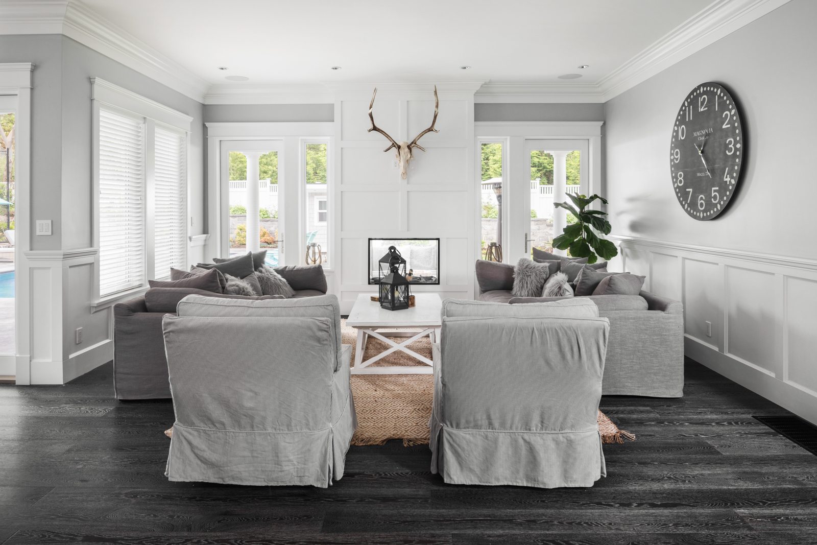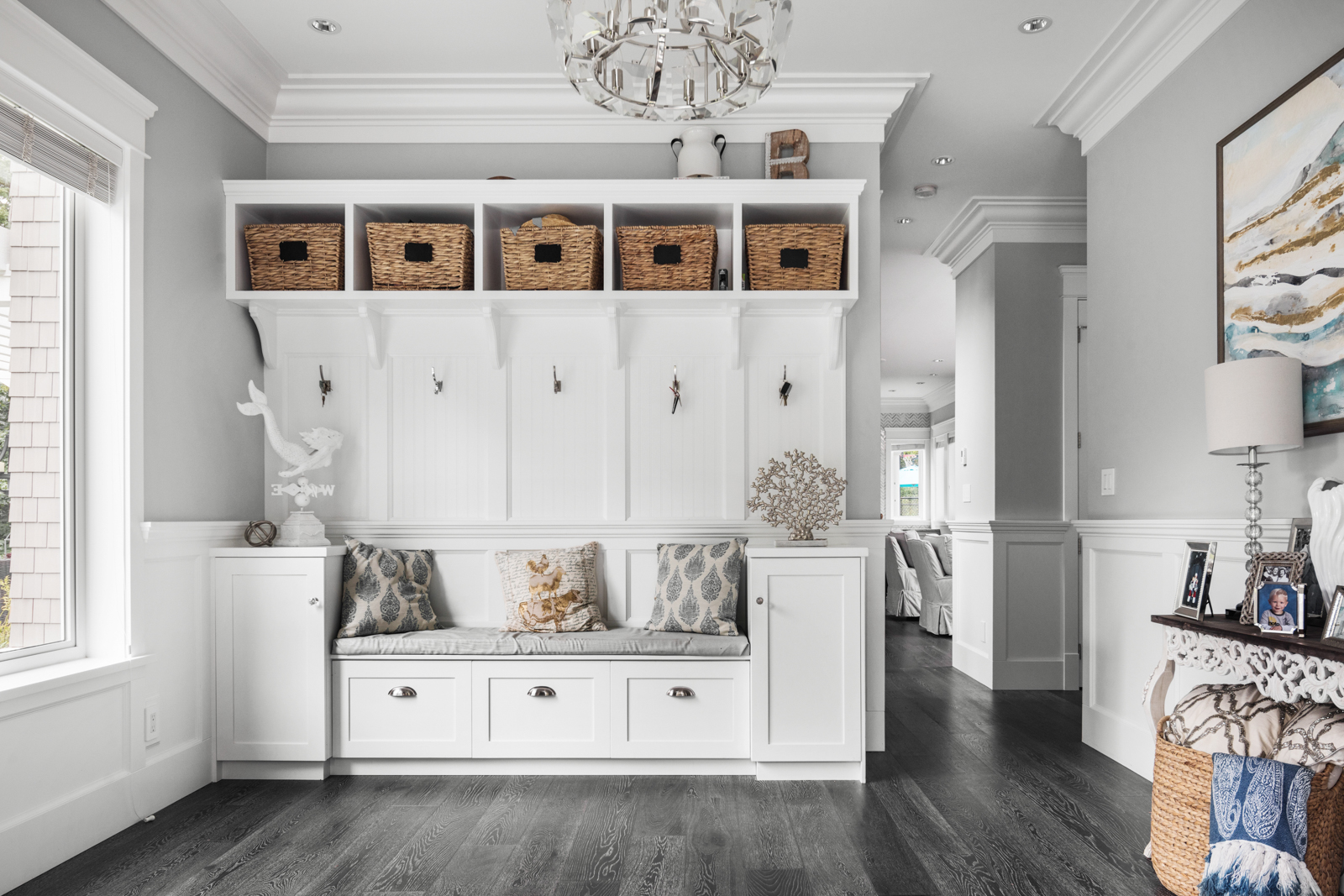 - Charcoal colored, wide-plank oak flooring extends throughout open-plan main living area with bedrooms up; warm, West Coast tones provide a natural transition to the landscape outside the numerous windows. Timeless details include built-ins throughout for ample storage, and French doors extending the living space outdoors.