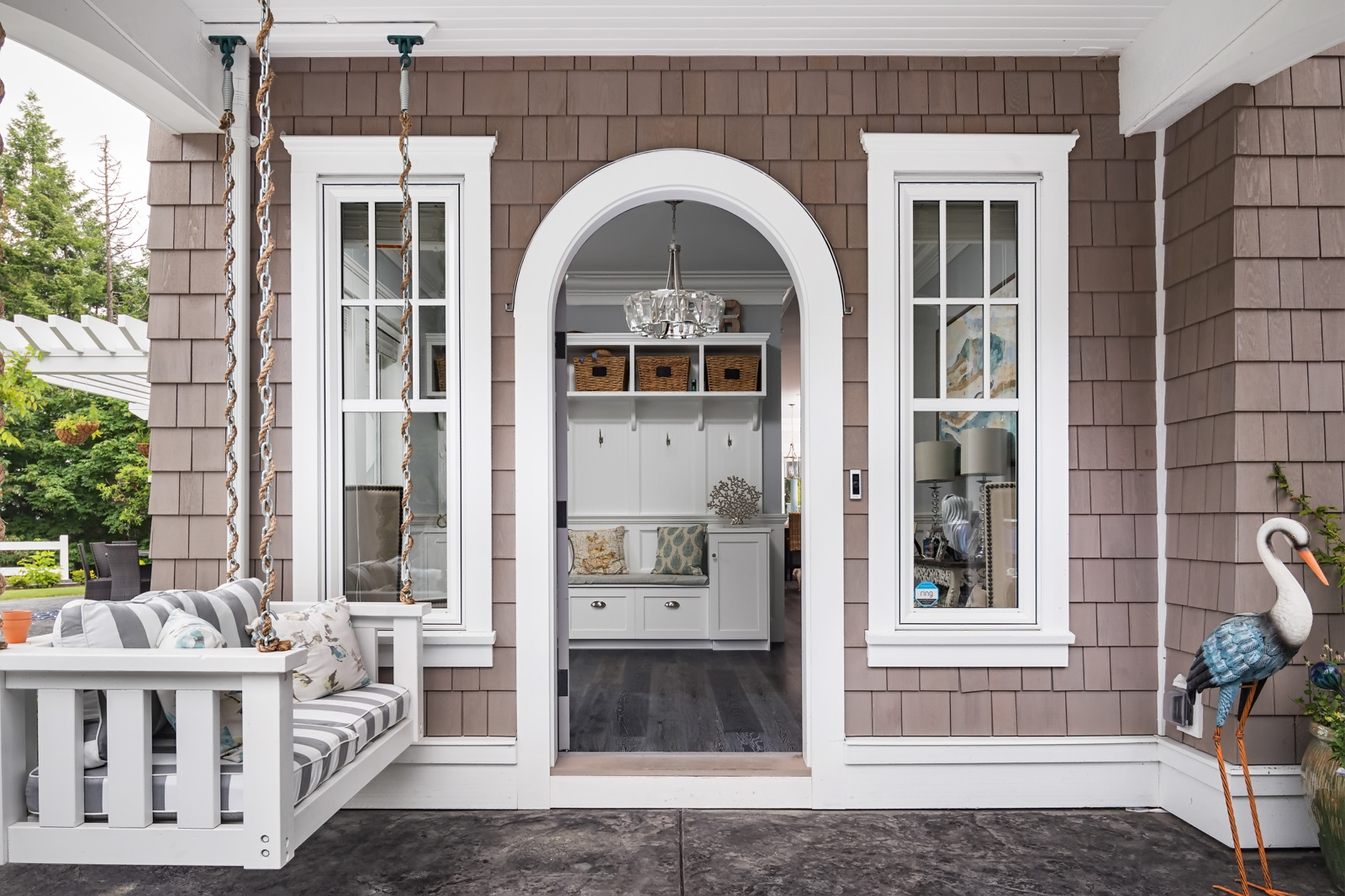 - This 3-bedroom, 3-bath custom farmhouse with European-inspired contemporary details, complemented with smart home wiring, is designed for an active family. Cedar shake and comb-face spruce battens provide a West Coast accent to the HardiPanel siding; arched oak front door opens to elegant, functional entry with custom built-ins for family organization;