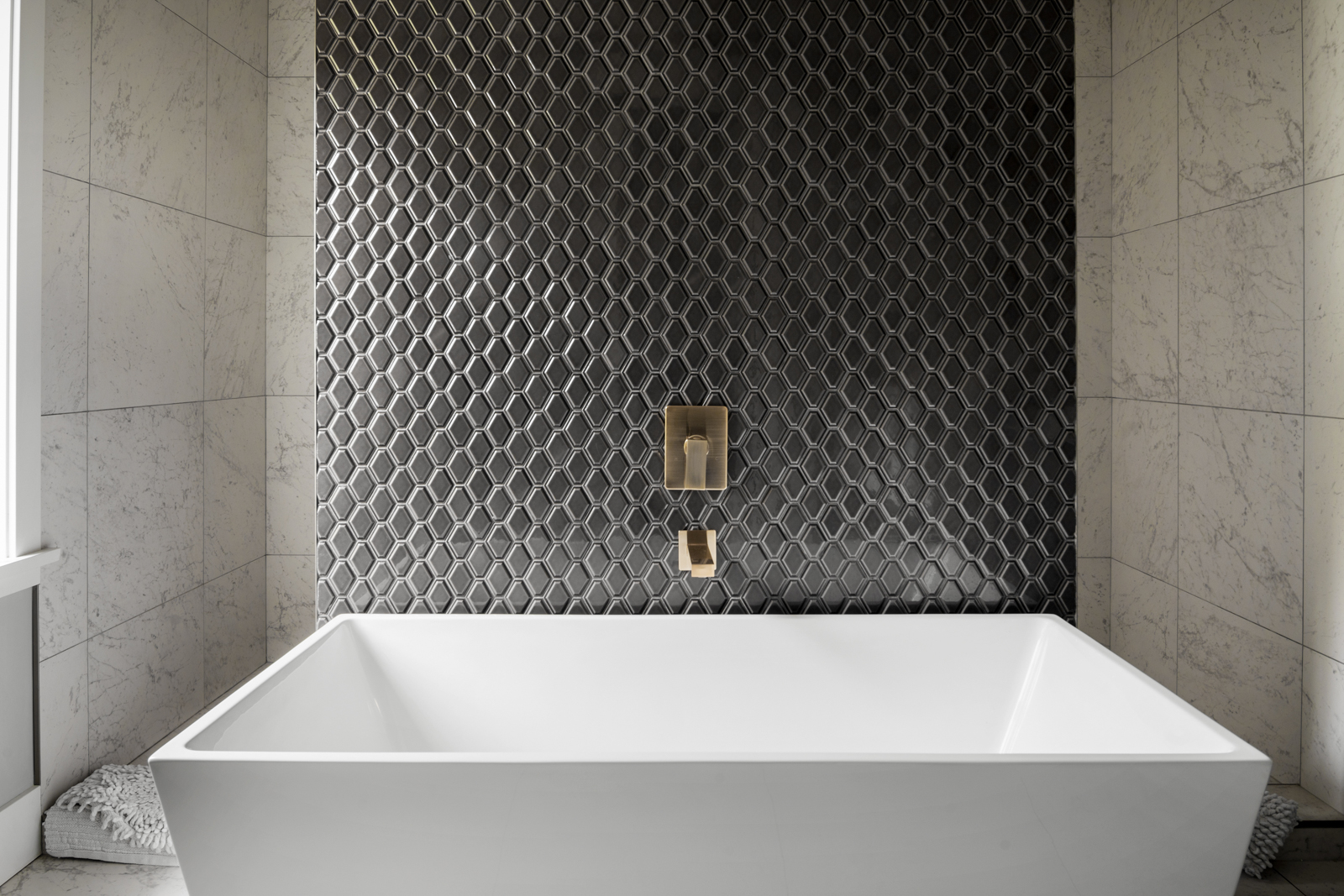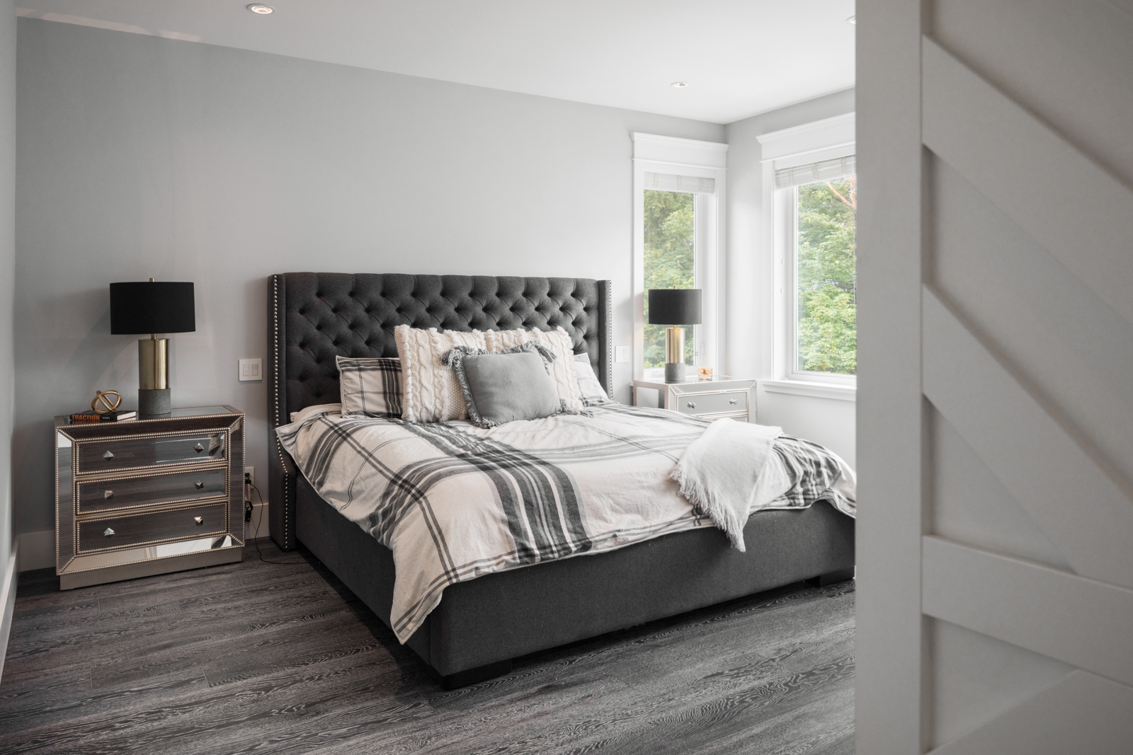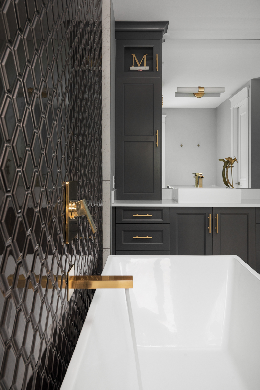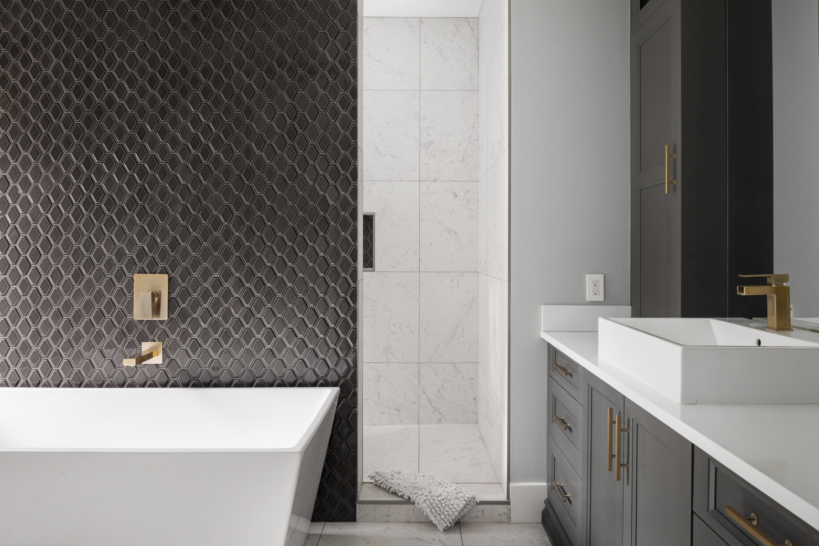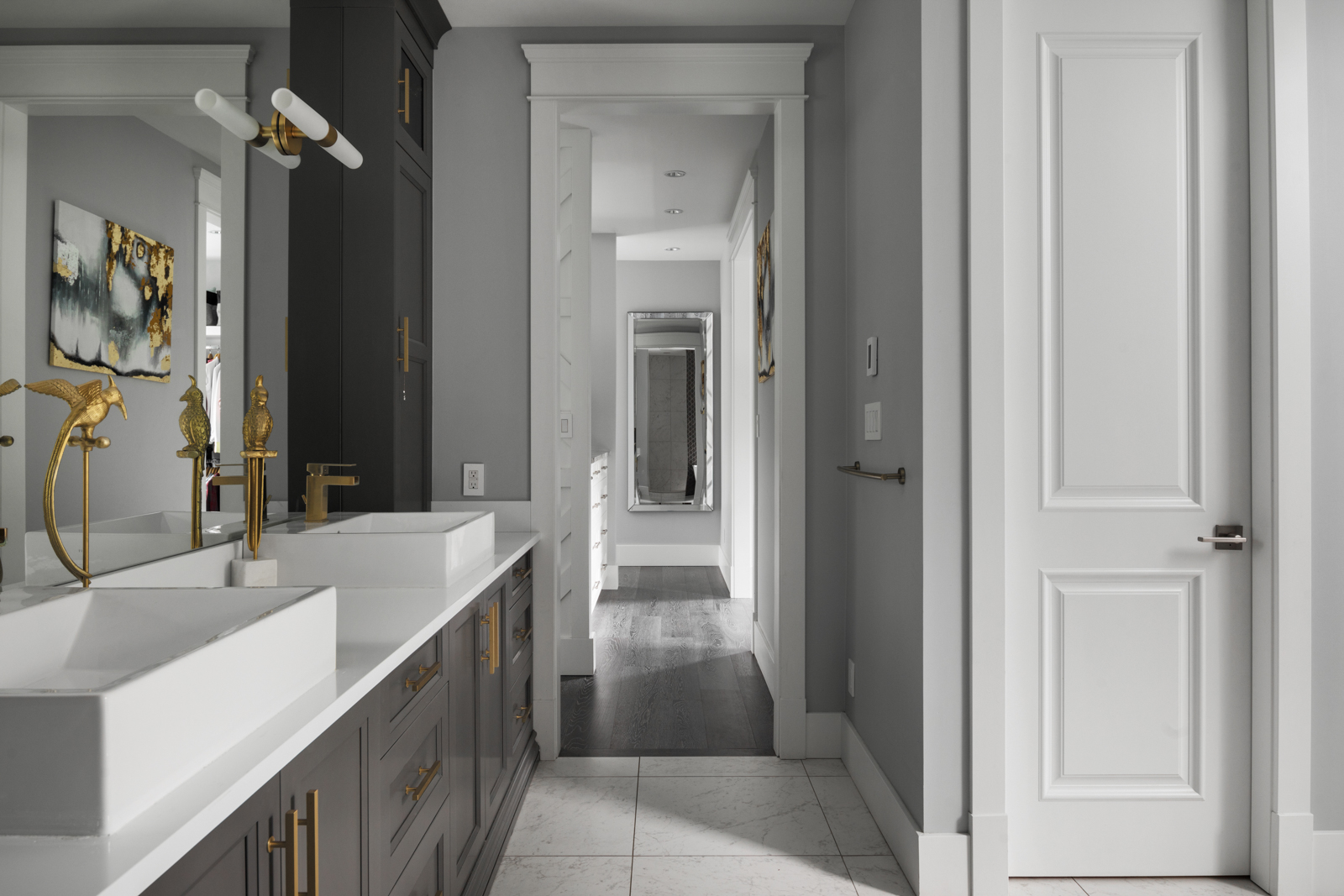 - Spacious master enjoys ample natural light, cozy gas fireplace, luxurious ensuite with diamond tile backsplash, spacious walk-in shower, contemporary soaker tub with gold-toned fixtures, and custom dual vanity.