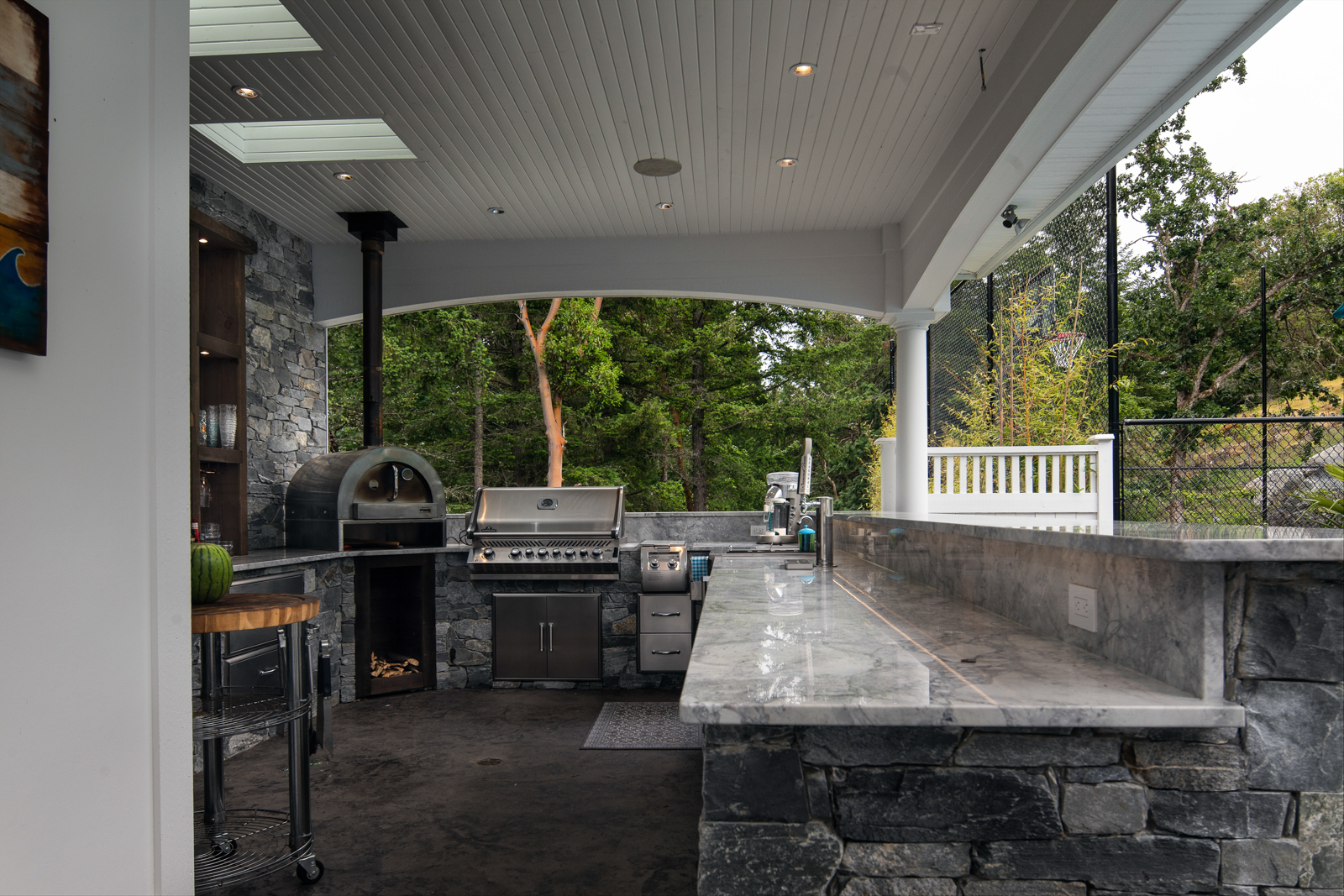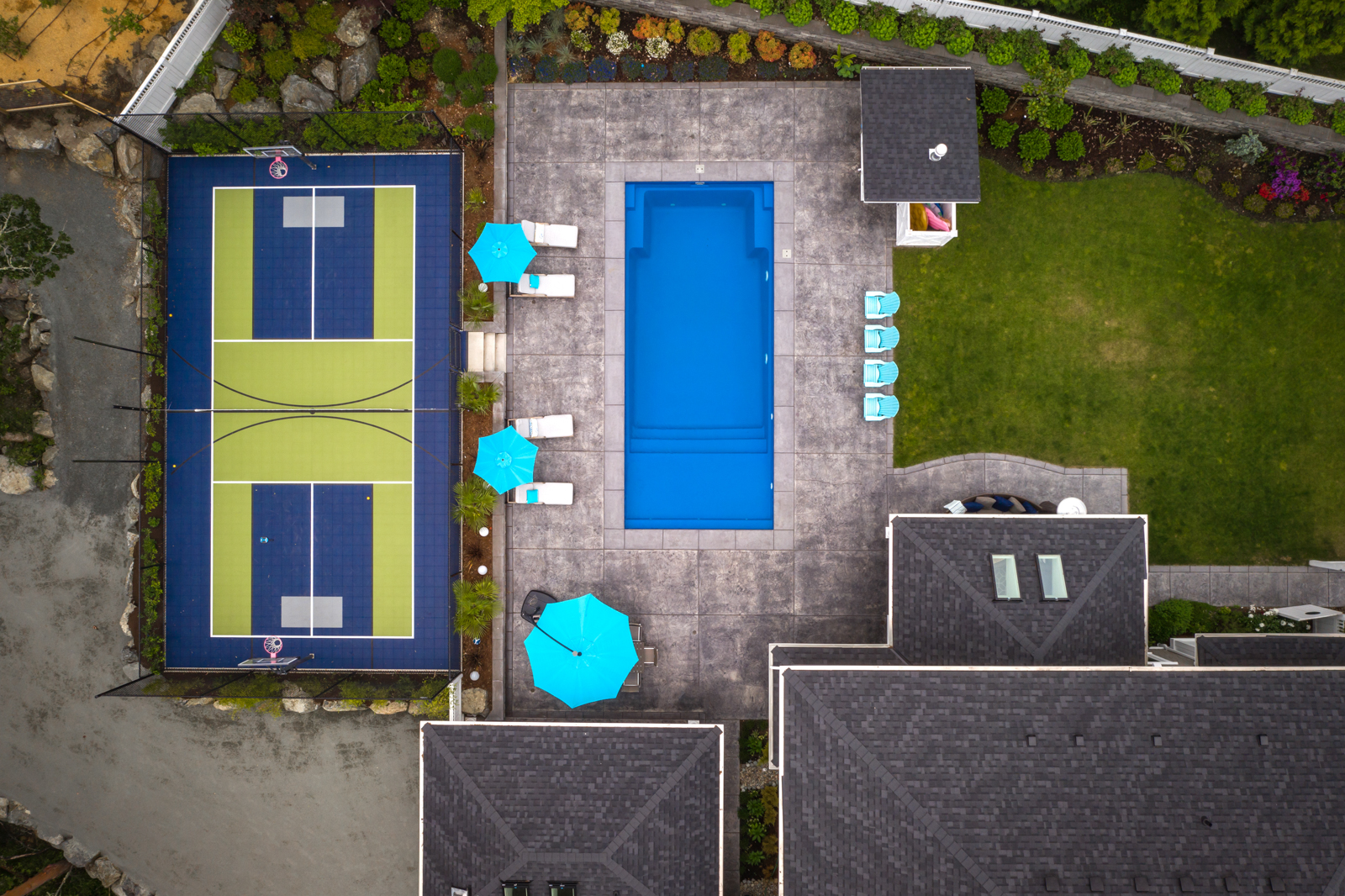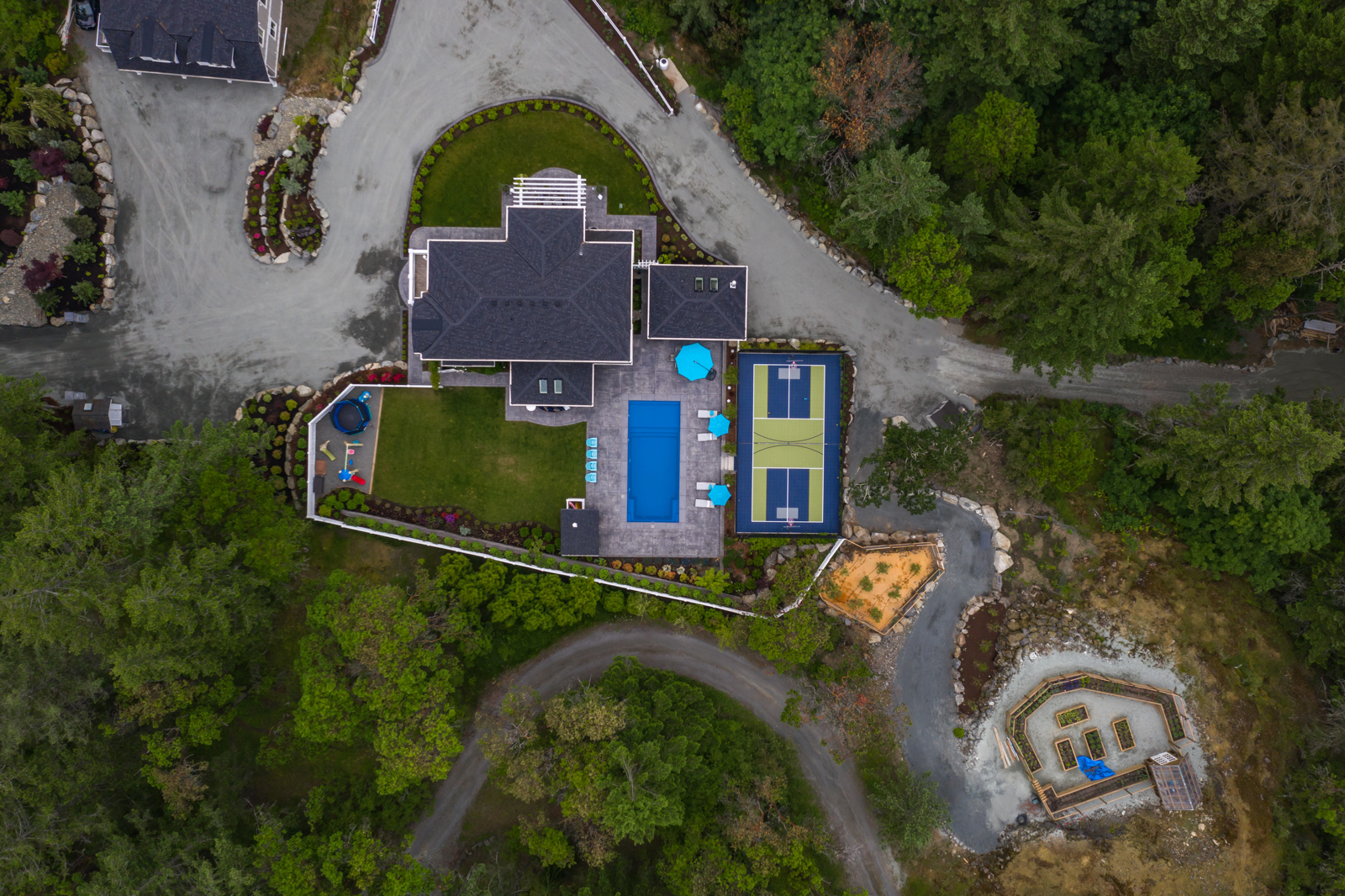 - Previously undeveloped 4-acre rural property required extensive site preparation and blasting to accommodate the new home; careful siting meant removing few trees and blasted shale was re-used to build a base for the long driveway, pool and sport court. Outdoor living includes a huge covered outdoor kitchen and bar overlooking the pool and patios.