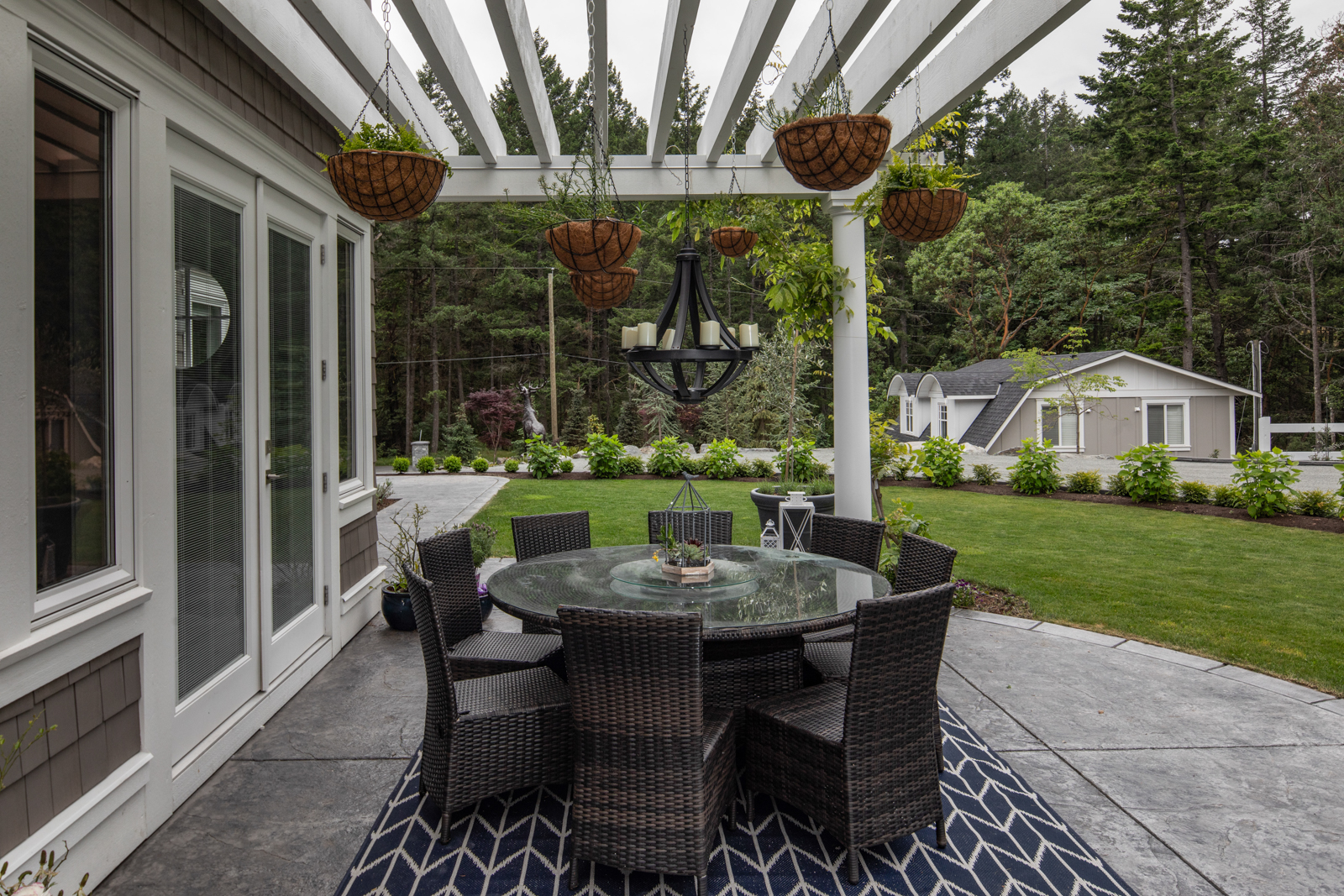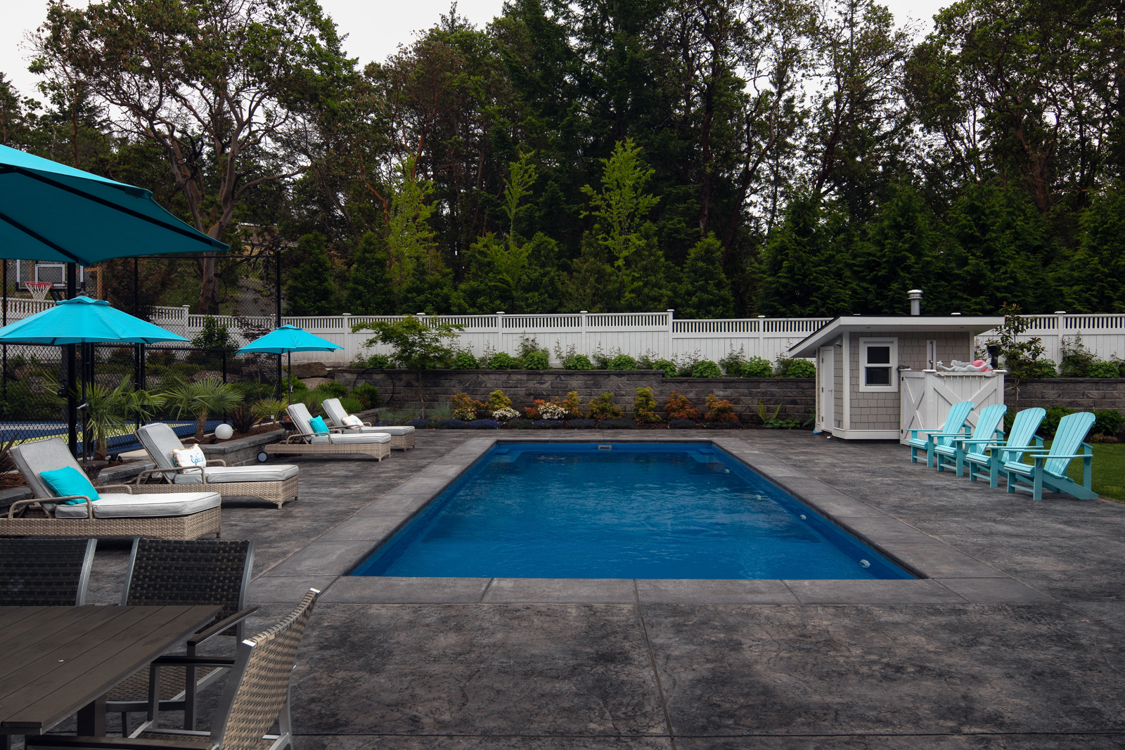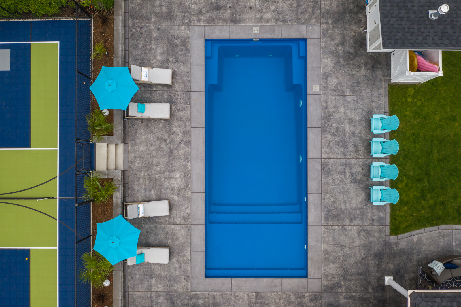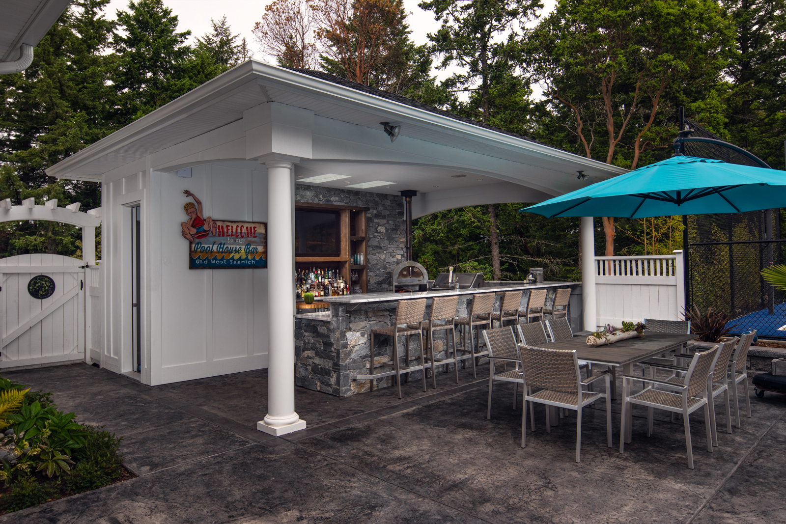 - Previously undeveloped 4-acre rural property required extensive site preparation and blasting to accommodate the new home; careful siting meant removing few trees and blasted shale was re-used to build a base for the long driveway, pool and sport court. Outdoor living includes a huge covered outdoor kitchen and bar overlooking the pool and patios.